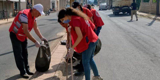 نظم متطوعو شعبة الهلال الأحمر العربي السوري في بلدة الثعلة بالسويداء بالتعاون مع مجلس البلدة يوم عمل تطوعي للنظافة.