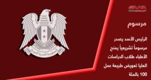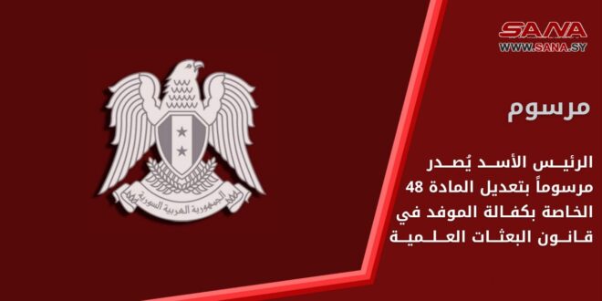أصدر السيد الرئيس بشار الأسد المرسوم التشريعي رقم (23) لعام 2024 القاضي بتعديل المادة (48) المتعلقة بكفالة الموفد في قانون البعثات العلمية الصادر بالمرسوم التشريعي رقم (6) لعام 2013.