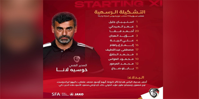 أعلن المدير الفني لمنتخب سورية الأول بكرة القدم الإسباني خوسيه لانا التشكيلة التي سيخوض بها منتخبنا مباراته مع منتخب موريشيوس في وقت لاحق اليوم ضمن بطولة الهند الدولية.