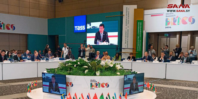 ولفت ممثل وكالة “سانا” إلى أن سورية وروسيا شركاء في مكافحة الإرهاب وقوى الشر والنازية الجديدة، سواء في الشرق الأوسط أو أوكرانيا أو أي منطقة، مشيراً إلى أن مجموعة بريكس تضطلع مع منظمة شنغهاي ومنظمة معاهدة الأمن الجماعي بدور الرائد في التحولات العالمية دفاعاً عن سيادة الدول واستقلالية قرارها وحقوق شعوبها الأساسية، بما في ذلك الحق في معرفة الحقيقة والإعلام الصادق.
