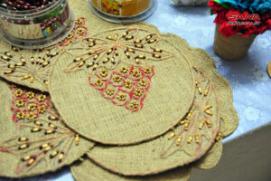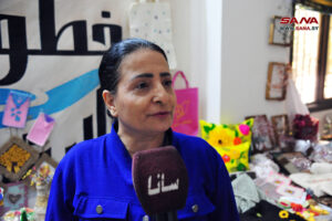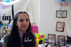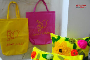 ومن السويداء شاركت كارماليندا رسلان من فريق الغصن العتيق بعرض مجموعة من الأعمال والمشغولات اليدوية مصنوعة من الكروشيه والقطبة الفلسطينية والخرز والمجسمات والحقائب والريزين من نتاج عمل سيدات خبيرات بهذه الأعمال.