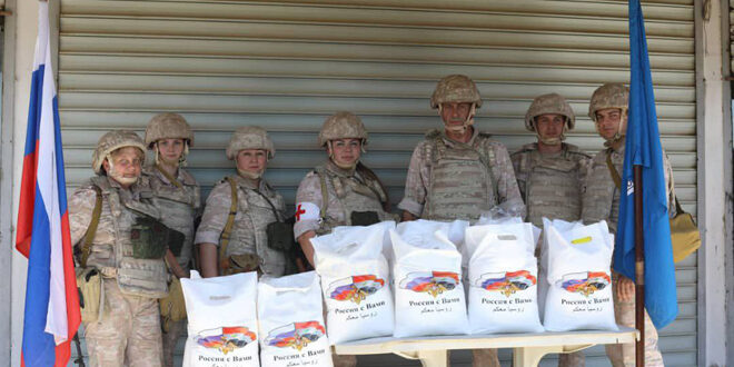 وزع مركز التنسيق الروسي في قاعدة حميميم مساعدات غذائية على أهالي قرية خربة أبو خسروف في منطقة القرداحة بريف اللاذقية.