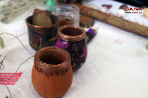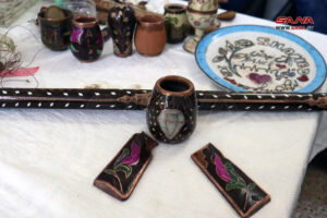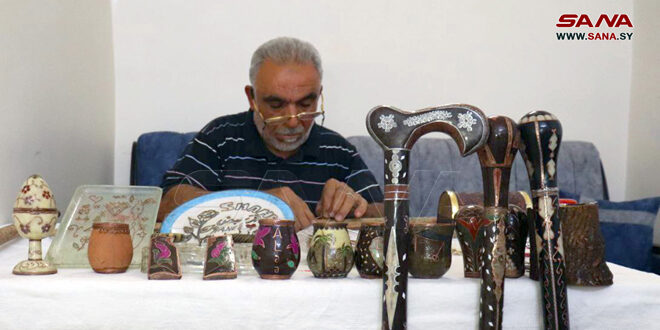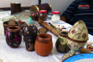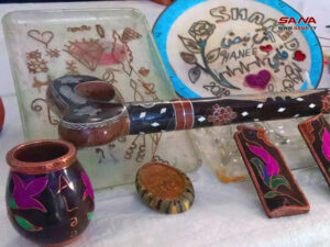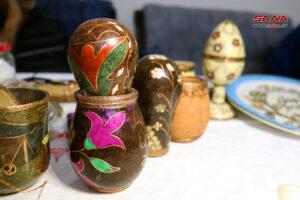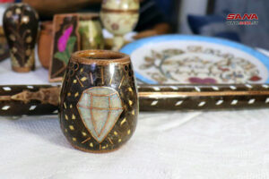 ورغم ما تتطلبه من وقت وجهد كبيرين باعتبارها مهنة يدوية بالكامل، إلا أن حنطاية استطاع تقديمها بروح جديدة تتماشى مع متطلبات العصر، حيث أوضح في لقاء مع مراسلة “سانا” أن تكلفة إنتاج قطع الأرابيسك التقليدية أصبحت مرتفعة، ما دفعه إلى تطوير المهنة لتكون في متناول الجميع فقام بإدخال الأرابيسك بصورة جديدة، حيث بدأ بصنع كاسات المتة، والفناجين، وصمديات بأحجام مختلفة، إضافة إلى العكازات والميداليات وحتى الإكسسوارات، ما أعطى لهذه الحرفة بعداً جديداً، مشيراً إلى أنه يستخدم ألواناً نباتية طبيعية في تلوين منتجاته، مثل البن ونواة التمر، حيث يقوم بتحويل نواة التمر إلى بودرة لاستخدامها في التلوين أو تشكيلها على شكل صدف.