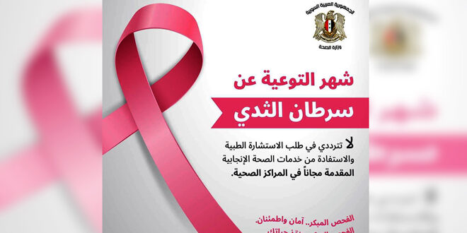 وتبذل وزارة الصحة جهوداً كبيرة لنشر ثقافة الكشف المبكر عن سرطان الثدي من خلال إقامة الفعاليات والندوات الصحية والتوعوية عن طريقة الفحص الذاتي للثدي وأهميته وإجراء الفحوصات التشخيصية والتأكيد على ضرورة الاستفادة من الخدمات المجانية المقدمة خلال الشهر الوردي، بحسب مديرة برنامج الصحة الإنجابية الدكتورة آلاء عرقسوسي.