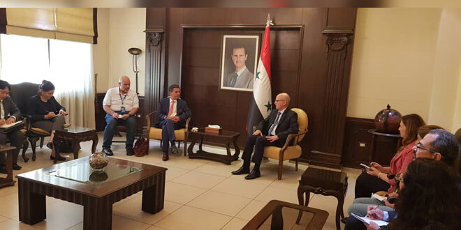 بحث وزير الإدارة المحلية والبيئة المهندس لؤي خريطة رئيس اللجنة العليا للإغاثة خلال لقائه اليوم مع رئيس بعثة مفوضية الأمم المتحدة لشؤون اللاجئين في سورية غونزالو غابرييل فارغاس يوسا والوفد المرافق، التعاون القائم وسبل تطويره في ضوء الظروف الحالية ووصول أعداد من الوافدين اللبنانيين والعائدين السوريين إلى المحافظات، جراء العدوان الإسرائيلي السافر على الأراضي اللبنانية.