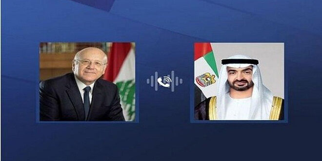 وذكرت وكالة وام الإماراتية للأنباء أن الشيخ محمد بن زايد شدد في اتصال هاتفي مع رئيس حكومة تصريف الأعمال اللبنانية نجيب ميقاتي اليوم على “وقوف دولة الإمارات إلى جانب الشعب اللبناني الشقيق في ظل الظروف التي يمر بها وجدد موقف الدولة تجاه وحدة لبنان وسيادته وسلامة أراضيه وضرورة تضافر الجهود الدولية لوقف إطلاق النار وتوفير الحماية الكاملة للمدنيين بموجب القانون الدولي”.
