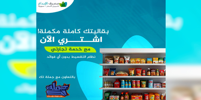 أعلن مصرف الإبداع للتمويل الأصغر “سورية” عن إطلاق خدمة “تجارتي” بالتعاون مع شركة إنماء الشام “جملة تك”، والهادفة إلى تمويل مشتريات المنشآت التجارية الصغيرة ومتناهية الصغر بنظام التقسيط ودون فوائد.