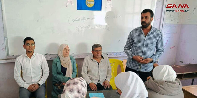بدوره تحدث الدكتور مناضل بكرو، والممرضة ريم الحسين عن مرض سرطان الثدي وأسباب الإصابة به، وطرق الوقاية وكيفية العلاج وأهمية الكشف المبكر عنه، مؤكدين أهمية نشر التوعية الصحية لضرورة الاهتمام بإجراء الفحص الذاتي الشهري والفحص السريري أو التصوير الماموغرافي بشكل دوري، ضمن برتوكولات استقصائية محددة ووفق العمر وعوامل الخطورة.