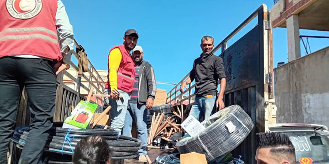 بدوره وزع فرع الهلال الأحمر بدرعا 200 سلة غذائية ومواد إيواء وإغاثة.