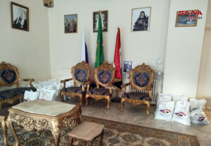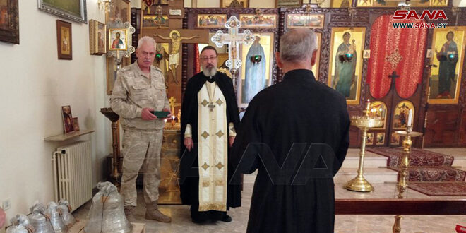 سلم مركز التنسيق الروسي في سورية خمسة أجراس كنائس إلى المكتب التمثيلي للكنيسة الأرثوذكسية الروسية في دمشق مقدمة من بطريركية موسكو.