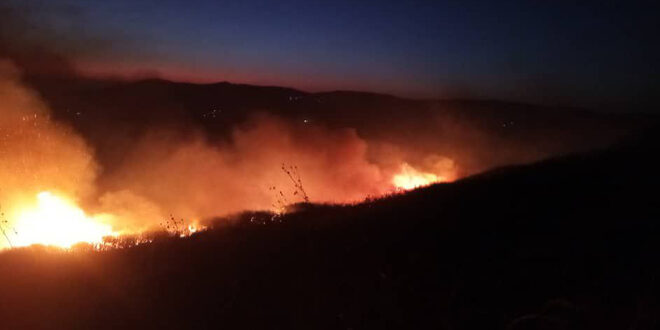 في ريف حمص الغربي، وامتد باتجاه أراضي قرى بلاط وعين الغارة، حيث تعمل فرق الإطفاء على إخماده.