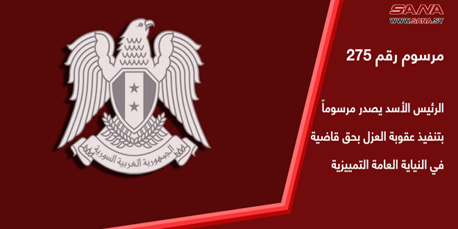 أصدر السيد الرئيس بشار الأسد المرسوم رقم (275) القاضي بتنفيذ عقوبة العزل التي فرضها مجلس القضاء الأعلى بقراره رقم 28-12 تاريخ 28- 10-2024 بحق القاضي “منى محمد ناصر دغمش”، القاضي في النيابة العامة التمييزية، من المرتبة الرابعة والدرجة الأولى، وتصفى حقوقها وفقاً للقوانين النافذة.