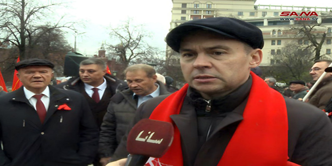 وأكد عضو مجلس الرئاسة للحزب الشيوعي في روسيا أن الشعب الروسي يقف بكل فئاته الاجتماعية إلى جانب الشعوب العربية في المنطقة وبصورة خاصة إلى جانب سورية في نضالها من أجل تحرير كافة أراضيها من التواجد العسكري الأجنبي واقتلاع جذور التنظيمات الإرهابية التي عاثت فساداً وتخريباً في سورية بتخطيط ودعم من بلدان الناتو وغيره.