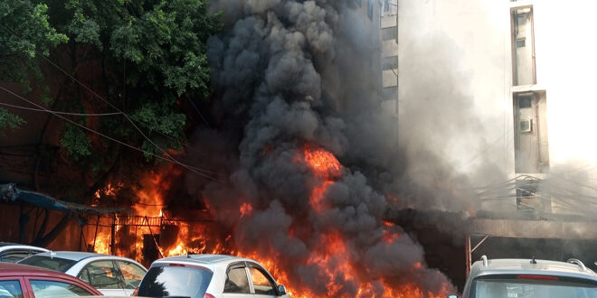 احترقت وتضررت عشرات السيارات جراء حريق بمولد كهربائي اندلع اليوم في موقف للسيارات بأحد شوارع العاصمة اللبنانية بيروت.