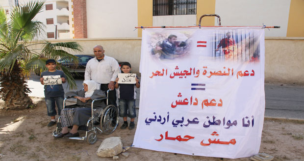 نظم مواطن أردني مع عائلته اعتصاما أمام السفارة الأردنية بدمشق تنديدا بدور النظام الأردني في دعم التنظيمات الإرهابية المسلحة في سورية.
