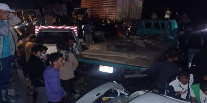 وحسب وسائل إعلام مصرية: إن الحافلة التي اصطدمت بسيارة النقل كانت تقل عمالاً، ما أدى إلى مصرع 10 منهم في الحادث، إضافة إلى مصرع شخصين آخرين من السيارات الأخرى، بينما وصل عدد الإصابات إلى 17 شخصاً.