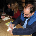 كما وقع الشاعر نضال بغدادي مجموعته “سيرة موت غريب” التي قدمها بأسلوب فني تزينه الصورة والتشبيهات، وانعكاس الواقع بشكل صادق وعفوي، وما فيه من معاناة يتحملها الإنسان البسيط.