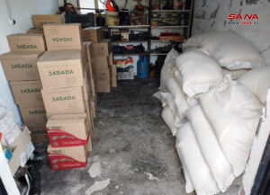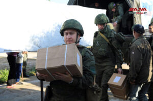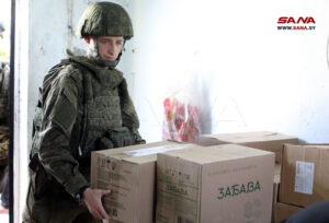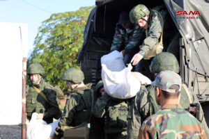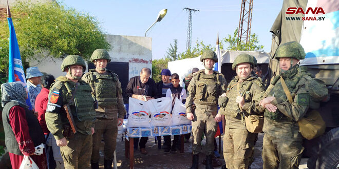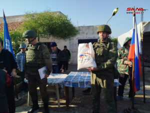 وذكر مراسل سانا أنه تم توزيع المساعدات لأهالي القرية، حيث قام العسكريون الروس بتسليم أكثر من 3 أطنان من المساعدات الغذائية تشمل “الدقيق والسكر وزيت عباد الشمس والشاي والحليب المعلب”.