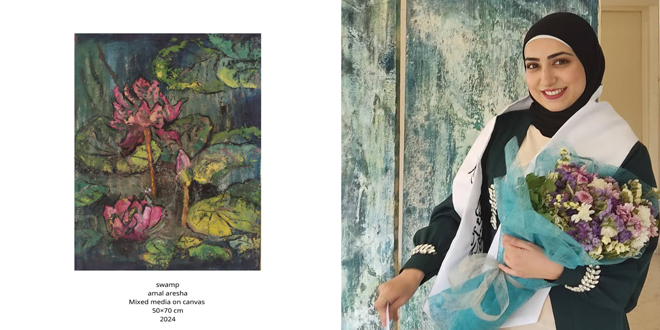 تسعى الفنانة التشكيلية الشابة أمل عريشة إلى وضع بصمتها في عالم الفن التشكيلي وأن تخلق لنفسها أسلوباً خاصاً يشع بالأمل والحياة ما يظهر جلياً في أعمالها.