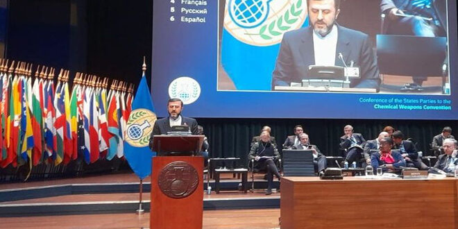 وأشار إلى التهديدات التي تمثلها ترسانة الكيان الصهيوني من الأسلحة الكيميائية على السلام والأمن الإقليميين والدوليين، وضرورة تحقيق شمولية للاتفاقية والضغط على هذا الكيان للانضمام إليها ووضع جميع منشآته الكيميائية تحت إشراف منظمة حظر الأسلحة الكيميائية.