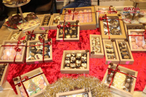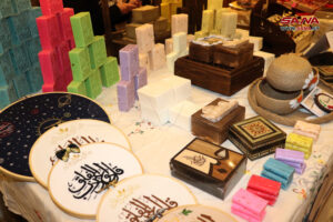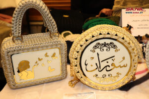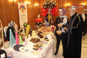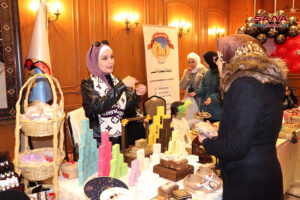 وضم المعرض الذي يستمر لمدة ثلاثة أيام حرفاً يدوية متنوعة لربات منازل وطالبات وخريجات أنتجن قطعاً من الكروشيه والشموع والصابون والعطور والفخار ومأكولات وحلويات من المطبخ الحلبي.