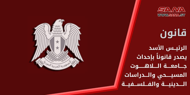 أصدر السيد الرئيس بشار الأسد اليوم القانون رقم (34) القاضي بإحداث جامعة خاصة باسم “جامعة اللاهوت المسيحي والدراسات الدينية والفلسفية”.