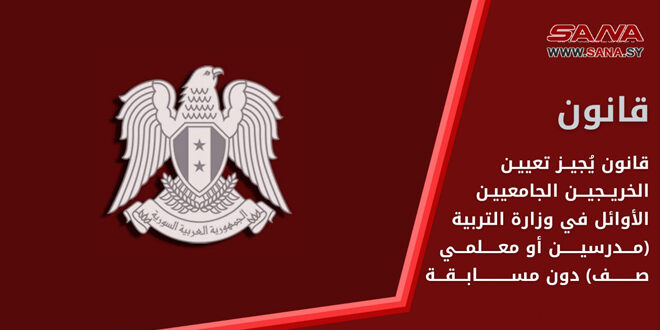 انطلاقاً من أهمية استمرارية واستقرار العملية التربوية والتعليمية في المدارس الحكومية وبهدف الاستفادة من الخريجين الجامعيين الأوائل في الاختصاصات ذات الصلة.. أصدر السيد الرئيس بشار الأسد اليوم القانون رقم (35) الذي يُجيز تعيين ما لا يزيد عن نسبة 10% من الخريجين الأوائل من كل قسم أو اختصاص يمنح درجة الإجازة الجامعية في نظام التعليم العام، في كل عام دراسي، في وزارة التربية والتعليم (مدرسين أو معلمي صف) من دون مسابقة.