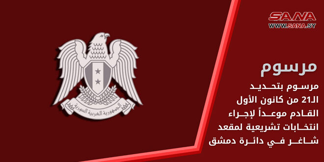 بناء على أحكام الدستور وعلى قانون الانتخابات العامة رقم (5) تاريخ 24- 3- 2014، أصدر السيد الرئيس بشار الأسد المرسوم رقم /301/ بتحديد يوم السبت الواقع في 21 من شهر كانون الأول من عام 2024 للميلاد موعداً لإجراء الانتخابات التشريعية، لملء المقعد الشاغر في دائرة محافظة دمشق الانتخابية عن القطاع /ب/.