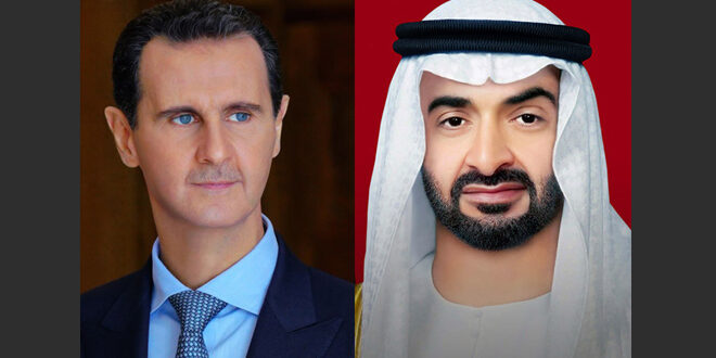 الشيخ محمد بن زايد أكد خلال الاتصال وقوف بلاده مع الدولة السورية ودعمها في محاربة الإرهاب وبسط سيادتها ووحدة أراضيها واستقرارها.