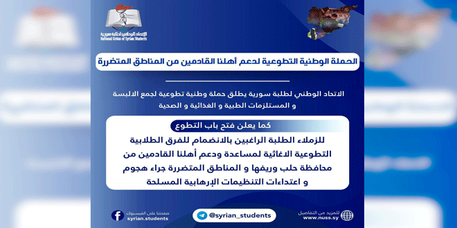 وبين الاتحاد في إعلانه الذي تلقت سانا نسخة منه أنه فتح أبواب التطوع للمشاركة ضمن الفرق التطوعية الشبابية والطلابية في دعم الأعمال الإغاثية ومساعدة أهلنا القادمين، داعياً الراغبين بالمشاركة بالحملة أو التطوع ضمن الفرق إلى مراجعة فروع الاتحاد الوطني لطلبة سورية والتنسيق معها، وهي موجودة وعلى متابعة مستمرة في كافة الجامعات والمعاهد الحكومية والخاصة.