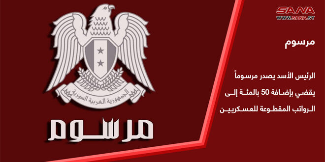 أصدر السيد الرئيس بشار الأسد المرسوم رقم / 28 / القاضي بإضافة نسبة 50% إلى الرواتب المقطوعة النافذة بتاريخ صدور هذا المرسوم للعسكريين المشمولين بأحكام قانون الخدمة العسكرية الصادر بالمرسوم التشريعي رقم /18/ لعام 2003 وتعديلاته، مع احتفاظ المستفيدين من أحكام هذا المرسوم التشريعي بقدمهم المؤهل لتبديل الدرجة والترقية.