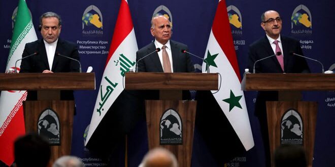 أكد وزراء خارجية سورية والعراق وايران في بيان مشترك عقب اجتماعهم في العاصمة العراقية بغداد اليوم بشأن آخر تطورات الأوضاع في سورية أن “تهديد أمن سورية يشكل خطراً عاماً على استقرار المنطقة برمتها، ولا خيار سوى التنسيق والتعاون والتشاور الدبلوماسي المستمر لإبعاد جميع مخاطر التصعيد في المنطقة”.