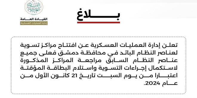 أعلنت إدارة العمليات العسكرية عن افتتاح مراكز تسوية لعناصر النظام البائد في محافظة دمشق.