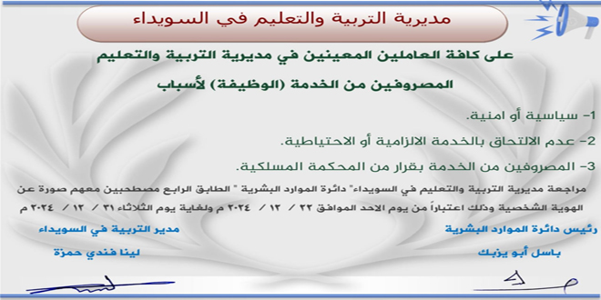 وبينت مديرة التربية والتعليم بالسويداء لينا حمزة في تصريح لمراسل سانا أنه على الراغبين بالعودة للعمل والمفصولين لأسباب سياسية أو أمنية أو لعدم الالتحاق بالخدمة الإلزامية أو الاحتياطية أو بقرار من المحكمة المسلكية مراجعة دائرة الموارد البشرية في المديرية اعتباراً من اليوم ولنهاية الشهر الحالي، مصطحبين معهم صورة عن الهوية الشخصية.