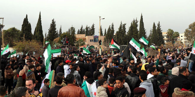 وحمل المواطنون علم الثورة السورية وصور الشهداء والمغيبين، ونددوا بالممارسات و الانتهاكات التي ارتكبها النظام البائد بحق أبناء سوريا.