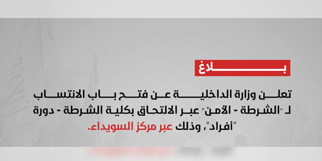 أعلنت وزارة الداخلية فتح باب الانتساب لـ “الشرطة – الأمن العام” عبر الالتحاق بكلية الشرطة “دورة أفراد”، وذلك عبر مركز السويداء.