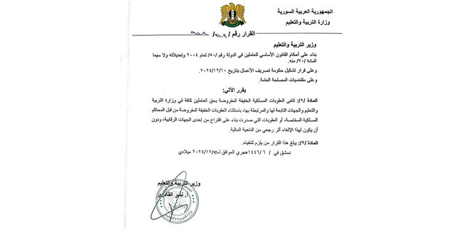 وبيّنت الوزارة في قرارٍ نشرته اليوم على صفحتها الرسمية على التلغرام أن القرار يتضمن إلغاء العقوبات المسلكية الخفيفة المفروضة من قبل المحاكم المسلكية المختصة، أو العقوبات التي صدرت بناءً على اقتراح من إحدى الجهات الرقابية دون أن يكون لهذا الإلغاء أثر رجعي من الناحية المالية.