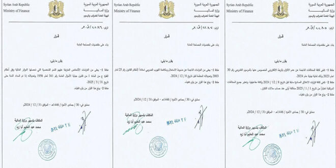 وحسب القرارات التي تلقت سانا نسخة منها “يعفى المكلفون من الغرامات الناجمة عن ضبوط الاستعلام ومكافحة التهرب الضريبي استناداً لأحكام القانون رقم 25 لعام 2003 وتعديلاته المنظمة قبل تاريخ الثامن من كانون الأول الماضي.”