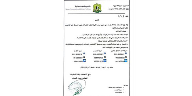 أكدت وزارة الاتصالات وتقانة المعلومات على ضرورة مراجعة الهيئة الناظمة للاتصالات والبريد للحصول على التراخيص اللازمة لتقديم عدد من الخدمات.