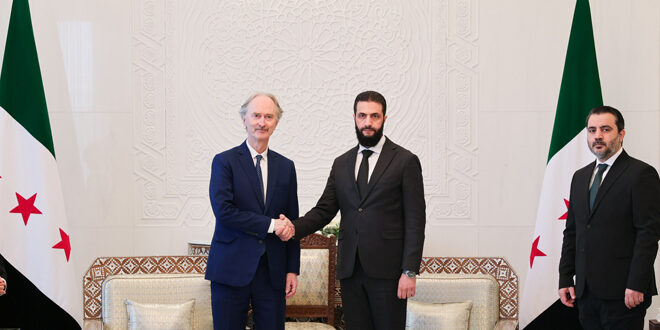 2025-01-20دمشق-ساناالتقى قائد الإدارة السورية الجديدة أحمد الشرع ووزير الخارجية أسعد الشيباني يلتقيان مع المبعوث الأممي لسوريا غير بيدرسون. القائد الشرع المبعوث الأممي لسوريا غير بيدرسون 2025-01-20Afraa