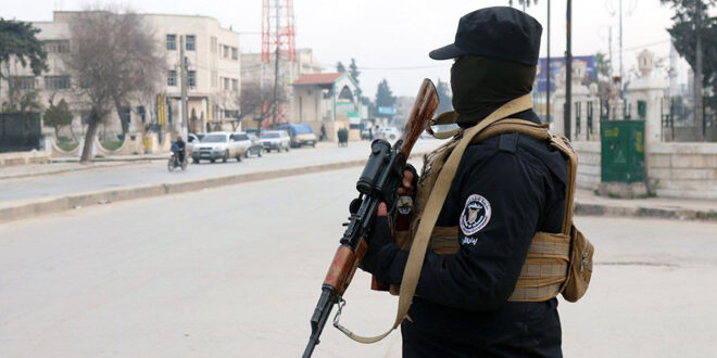 انتشار عناصر الأمن العام في ساحة السبع بحرات بمدينة إدلب لتأمين احتفالات النصر