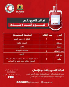 أعلنت منظمة الهلال الأحمر العربي السوري إطلاق حملة تبرع بالدم يوم السبت القادم في عدد من المحافظات، بهدف دعم رصيد بنوك الدم بإمدادات كافية، وذلك بالتعاون مع وزارة الصحة وشراكة المجتمع المحلي.
