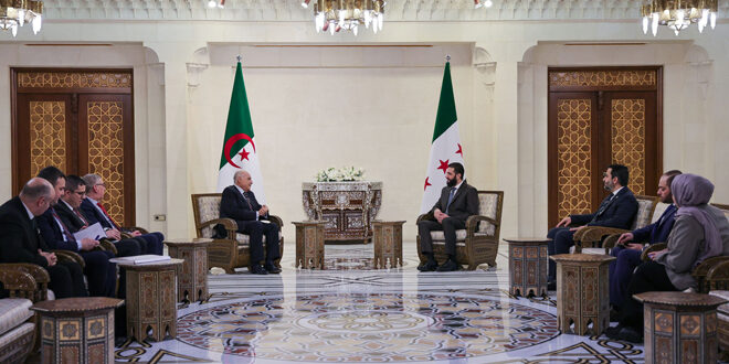 استقبل رئيس الجمهورية السيد أحمد الشرع ووزير الخارجية أسعد الشيباني وفداً رفيع المستوى من الجمهورية الجزائرية برئاسة السيد أحمد عطاف وزير الدولة وزير الشؤون الخارجية الجزائري.