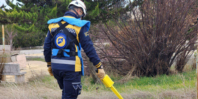 فريق من الدفاع المدني يجري مسحاً عن الذخائر غير المنفجرة في مستشفى معرة النعمان الوطني