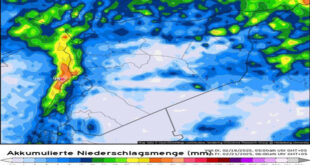 وتنشط حركة الرياح الجنوبية الغربية بشكل ملحوظ غداً الخميس، لتكون عند 30 كيلومتراً في الساعة، وتكون الهبات نشطة إلى قوية، تتراوح ما بين 45 و55 كيلومتراً في الساعة، على أجزاء واسعة من البلاد، فيما تبلغ الرياح ذروتها في جبال الساحل والمناطق الغربية في حمص وحماة، وشرق وشمال السويداء مع هبات تلامس حاجز الـ 75 كيلومتراً في الساعة، ويكون البحر عالي ارتفاع الموج.