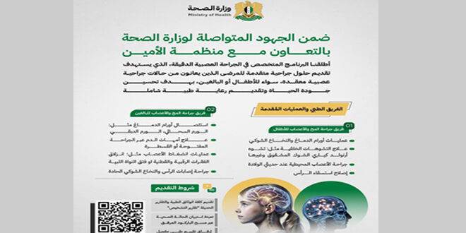 أطلقت وزارة الصحة بالتعاون مع الجمعية الدولية لرعاية ضحايا الحروب والكوارث “الأمين” البرنامج المتخصص في الجراحة العصبية الدقيقة، وذلك في إطار جهودها المتواصلة للنهوض بواقع القطاع الصحي في سوريا والارتقاء بمستوى الخدمات الطبية المقدمة للمرضى.