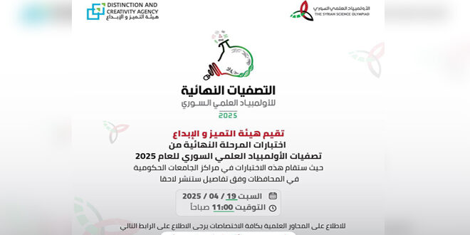 حددت هيئة التميز والإبداع يوم السبت الموافق لـ 19 نيسان القادم موعد إقامة المرحلة النهائية من تصفيات الفرق الوطنية للأولمبياد العلميّ السوريّ لموسم 2024 – 2025، الذي بدأه المشاركون بعد المرحلتين الأولى والثانية.
