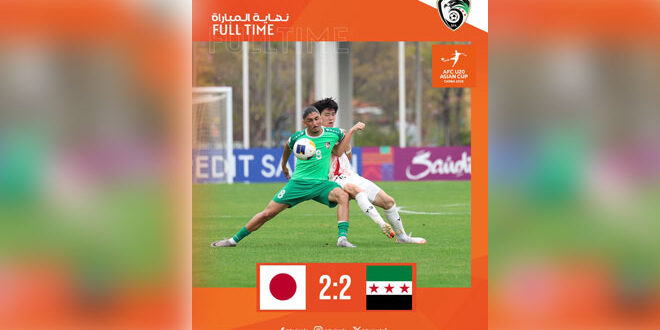 تعادل منتخب سوريا الوطني للشباب بكرة القدم (تحت 20 عاماً) مع نظيره الياباني بهدفين لمثلهما، ضمن منافسات الجولة الثانية من دور المجموعات ببطولة كأس آسيا المقامة حالياً في الصين.
