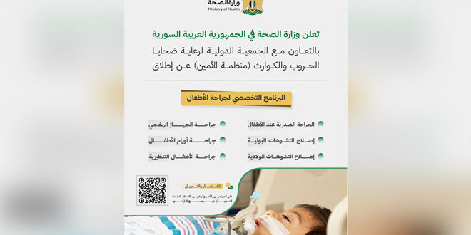 2025-02-23دمشق-ساناأعلنت وزارة الصحة بالتعاون مع الجمعية الدولية لرعاية ضحايا الحروب والكوارث (منظمة الأمين) إطلاق البرنامج التخصصي لجراحة الأطفال.وأوضحت الوزارة عبر منشور في قناتها على التلغرام أنه يمكن للمهتمين والراغبين بالاستفادة منه التسجيل عبر الرابط: وزارة الصحة 2025-02-23aline