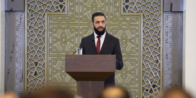وأشار الرئيس الشرع إلى أن سوريا بحاجة إلى قرارات جريئة تعالج مشكلاتها علاجاً حقيقياً ولو كانت مؤلمة وصادمة، فسوريا تراجعت عن محيطها الإقليمي والدولي، وعليها أن تسارع للحاق وينبغي اتخاذ الخطوات المناسبة لذلك، موضحاً أن السلم الأهلي واجب على أبناء الوطن جميعاً، إن الدعوات المشبوهة التي تستدعي حالة الخطر لطوائفَ ما وتَعرض نفسها الحامية المنقذة، هي دعوات فارغة لا تنطلي على الوعي السوري، فسوريا مدرسة في العيش المشترك يتعلم منها العالم أجمع، ولم يزل النظام البائد يخوف الناس من الفناء، حتى ظهر كذبه بأيام.